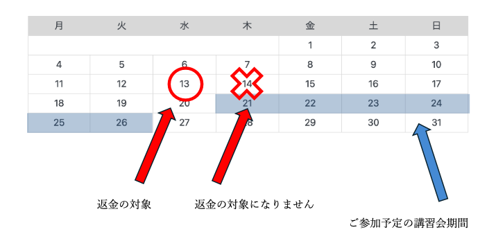 1週間前までにキャンセルを申し出た際には返金の対象にはなりますが、その後のキャンセルは返金の対象となりませんので、ご注意ください。